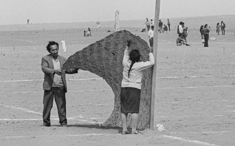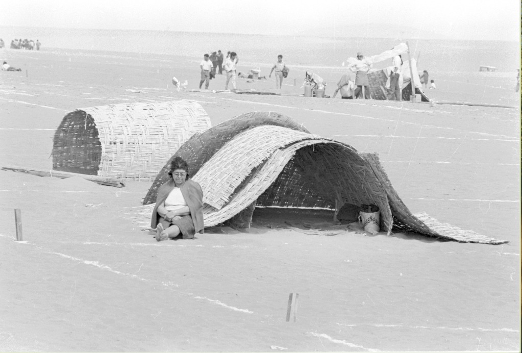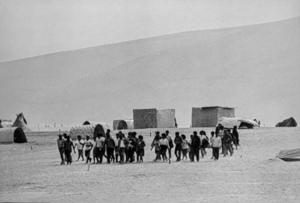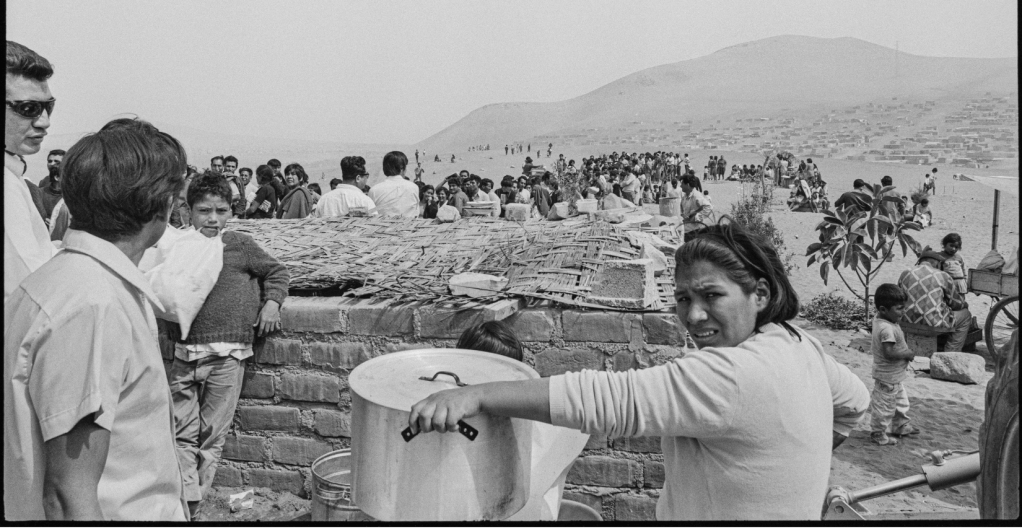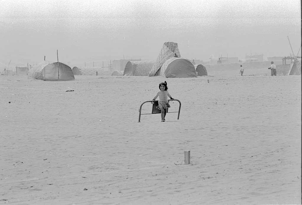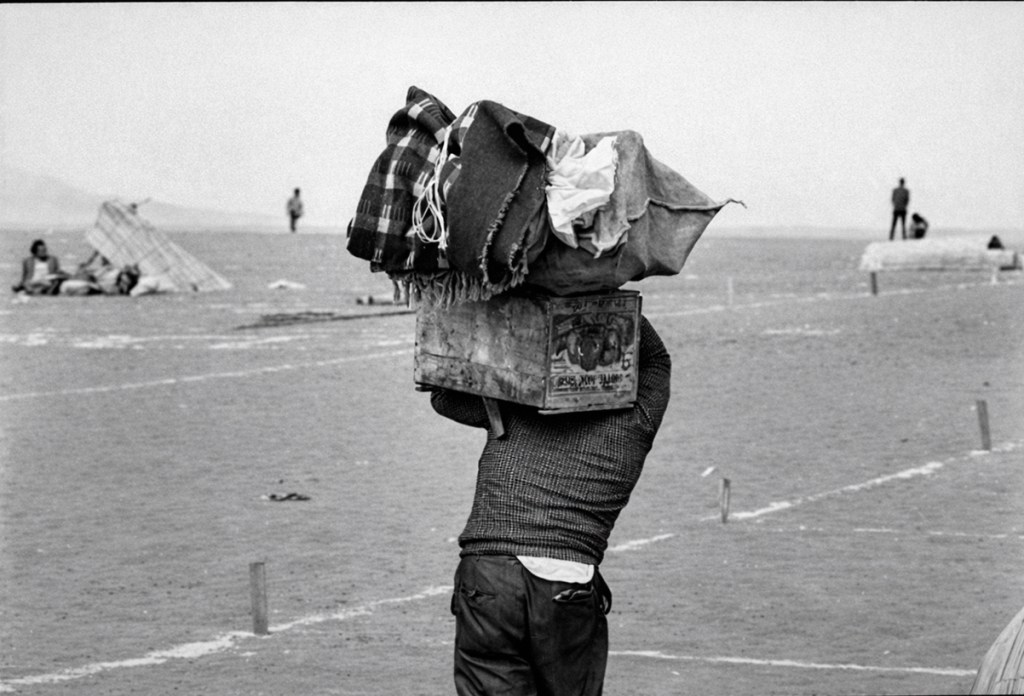 Hombres y mujeres forman cola para inscribirse y recibir sus lotes de vivienda en el ingreso a Villa El Salvador. Alfondo se observa el Cerro Papa.Hombres y mujeres en camino a conocer la ubicación de sus lotes. En la parte posterior se observa el Cerro Papa.Una mujer se toma un descanso luego de inatalar su chosa en forma de caracol en su lote de 140 metros cuadrados, cuyo perimetro esta delimitado por estacas y lineas de cal.En camino al lote de vivienda propio. Pareja de esposos levantando la primera chosa. En la parte posterior se observa otras familias ya instaladas en sus lotes.Niña arrastrando parte de una cama. En la parte posterior se observa las chosas de esteras instaladas en forma de caracol.